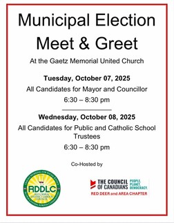 On Wednesday night, the Red Deer & District Labour Council and Red Deer Chapter of the Council of Canadians are co-hosting a Meet and Greet for school trustee candidates from both RDCRS and Red Deer Public Schools at Gaetz United Church.